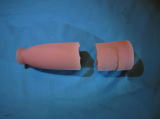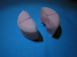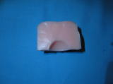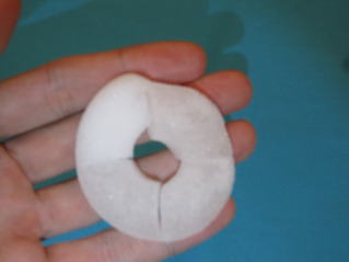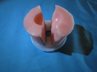 手順2.オナホから高さが4cm、底面の直径5cm、幅2cmの半円柱を2つ切り出て、ドーナツと接着する。